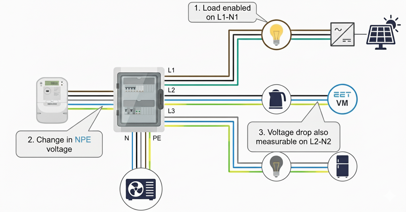 Every household appliance or home energy product (e.g. PV) causes a characteristic voltage drop or rise depending on how much power it draws or feeds back into the system. Even though each appliance is only connected to one out of three phases, it causes a shift in NPE voltage. This in turn is causing very small changes on the voltage of the other phases – making the household electricity usage measurable via any of the three phases.